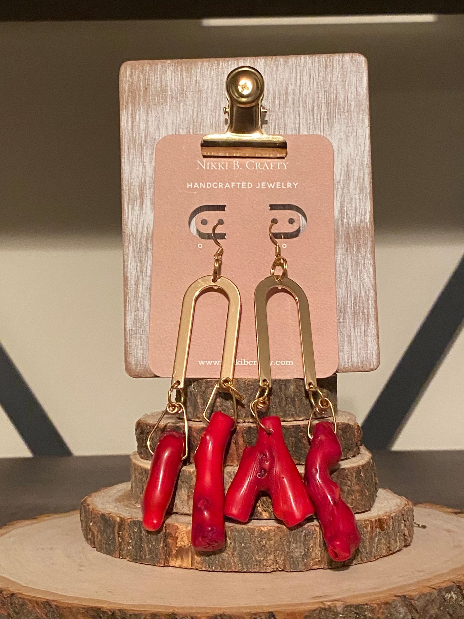 The Dynamic Earrings designed and handcrafted by NikkiBCrafty represents passion , zeal, and determination. Gold accents with a pop of red color. The irregular abstract design of the red bead invokes the feeling of freedom from constriction and Freedom from uniformity.